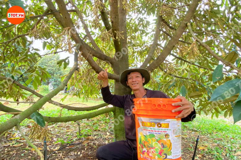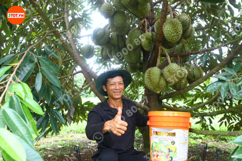 Trong đó, anh sử dụng xô Tano One chuyên chạy trái với công thức 3-3-12 và dạng Nano Chelate giúp cứng cuống trái, trái bám chắc, hạn chế rụng dù gặp thời tiết bất lợi.
