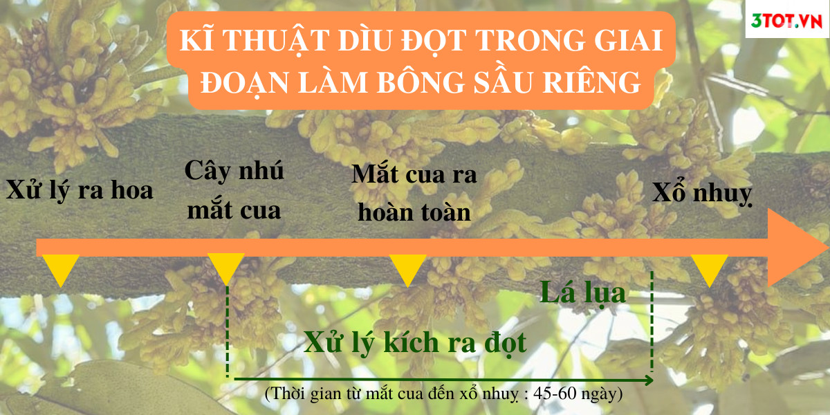 -Cây sầu riêng nhú mắt cua đến khi xổ nhuỵ thông thường từ 45-60 ngày. Trong thời điểm này cần phải kích cho cây ra đọt nhanh để đến khi xổ nhuỵ lá đã lụa hoặc chuyển già.
