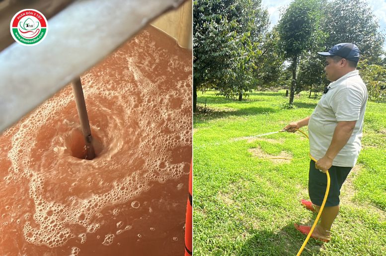 Tiếp tục hành trình , Phân Bón 3 TỐT lại ghé đến vườn anh Hải giữa lúc cô Đào quản lý vườn đang tưới Đạm cá hữu cơ - Dịch cá Bio Strong !