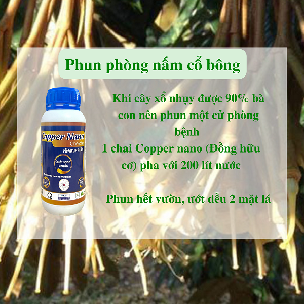 - 1 chai Copper nano (Đồng hữu cơ) pha với 200 lít nước. Sau đó tiến hành phun hết vườn, ướt đều 2 mặt lá.