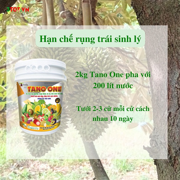 - 2kg Tano One pha với 200 lít nước, tưới 2-3 cử mỗi cử cách nhau 10 ngày. Để hạn chế rụng sinh lý.
