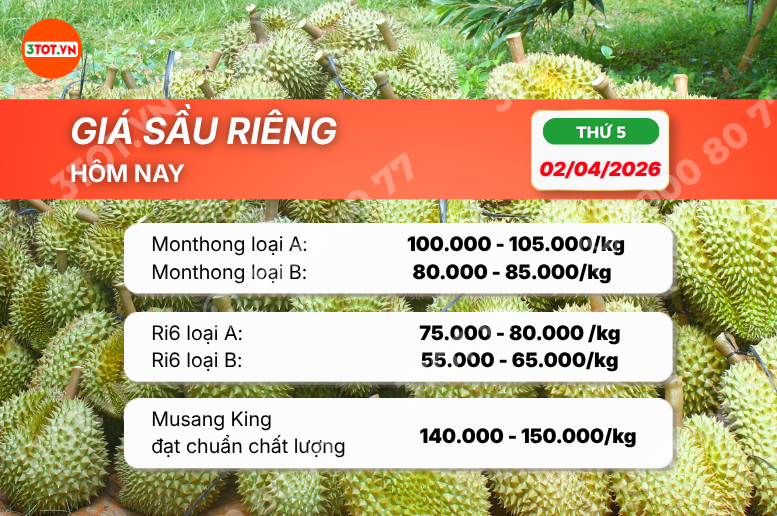 Giá sầu riêng hôm nay 02/04/2026 đi ngang tại nhiều khu vực. Cập nhật chi tiết giá Monthong, Ri6, Musang King và dự báo xu hướng mới nhất.