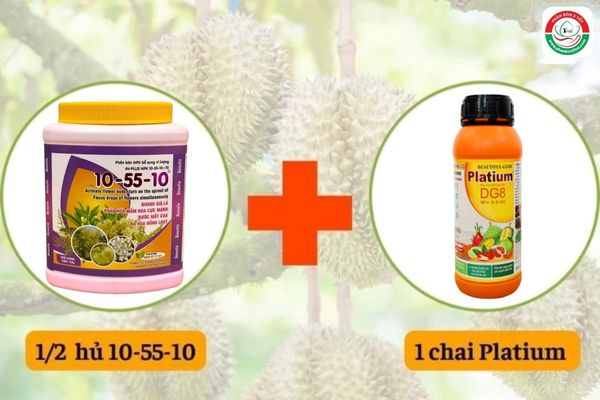 Bước 3: Phun xong phun dằn lá thêm 1 cử, tiến hành pha ½ hủ 10-55-10 + 1 chai Platium pha 200 lít phun chùm lá.