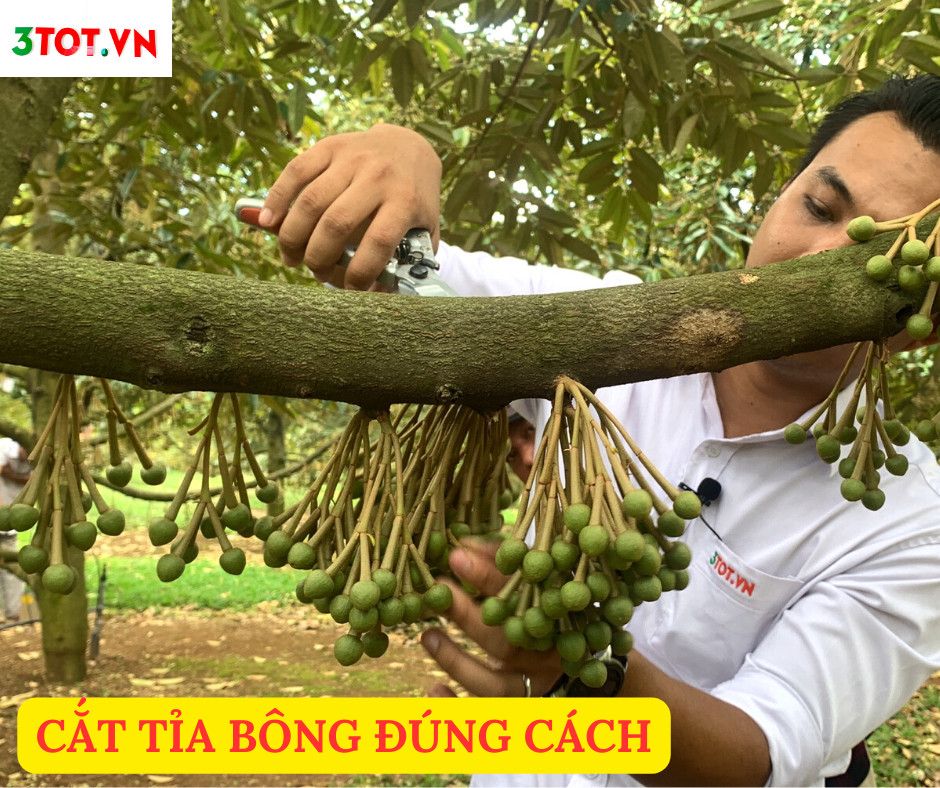 - Bà con lưu ý không nên ham để bông trên cây sầu riêng quá nhiều, đặc biệt là không được để bông trên cành nhỏ và đầu cành để hạn chế suy cây suy cành mà chất lượng năng suất lại không được cao, tốn công chăm sóc sau phục hồi thu hoạch và tăng chi phí.