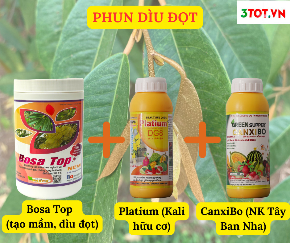 1 hũ Bosa Top (tạo mầm, dìu đọt) + 1 chai Platium (Kali hữu cơ) + 1 gói Siêu hoa pha 200 lít nước