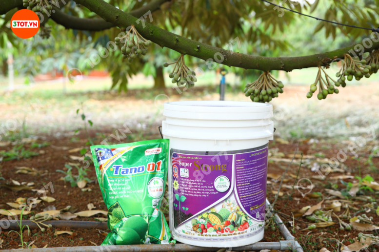 Công thức: 01 xô Super Strong hữu cơ khoáng + 03 gói Tano 01 pha với 2.000 – 10.000 lít nước (tùy tình trạng và độ tuổi của cây), tưới đều quanh vùng rễ, tránh tưới sát gốc.