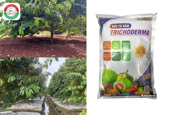(Hình ảnh vườn được dọn vệ sinh, tạo mương thoát nước và sản phẩm Trichoderma)