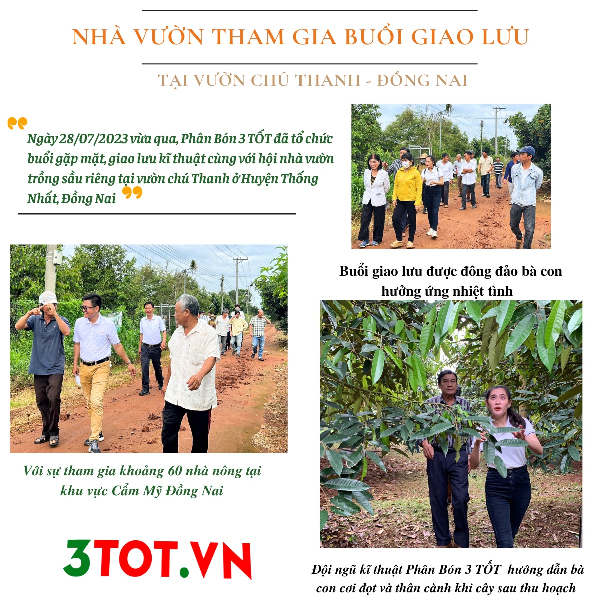 Ngày 28/07/2023 vừa qua, Phân Bón 3 TỐT đã tổ chức buổi gặp mặt, giao lưu kĩ thuật cùng với hội nhà vườn trồng sầu riêng tại vườn chú Thanh ở Huyện Thống Nhất, Đồng Nai.
