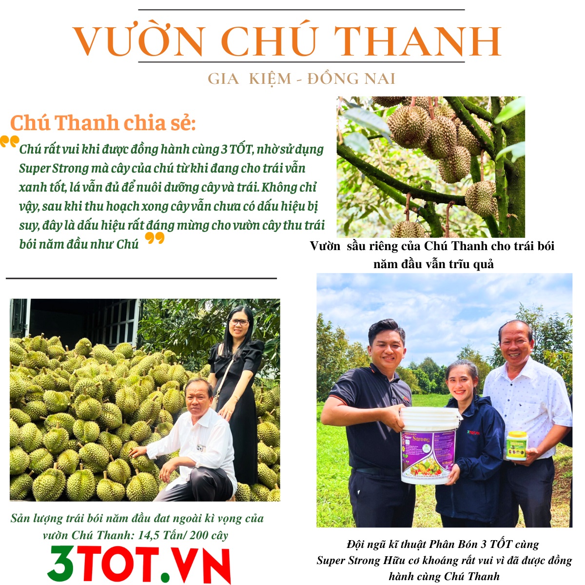 “Chú rất vui khi được đồng hành cùng 3 TỐT, nhờ sử dụng Super Strong mà cây của chú trong quá trình đang cho trái vẫn xanh tốt, lá vẫn đủ để nuôi dưỡng cây và trái. Không chỉ vậy, sau khi thu hoạch xong cây vẫn chưa có dấu hiệu bị suy, đây là dấu hiệu rất đáng mừng cho vườn cây thu trái bói năm đầu như Chú.”