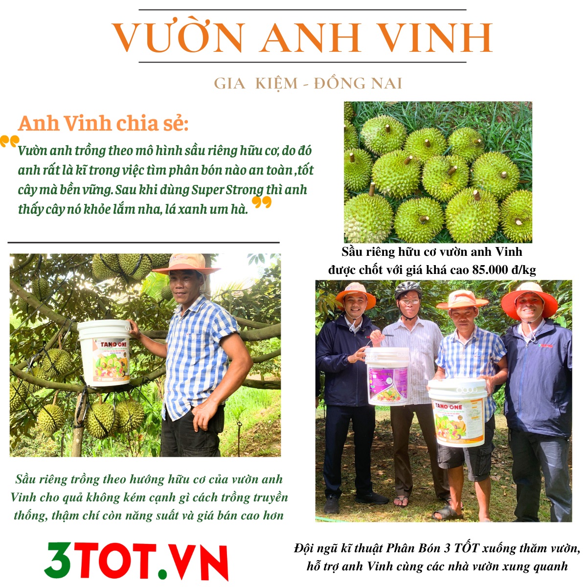 “Dùng các dòng sản phẩm của Phân Bón 3 TỐT ứng dụng và trồng theo mô hình làm sầu riêng hữu cơ cho quả không kém cạnh gì cách trồng truyền thống, thậm chí còn năng suất, nâng cao chất lượng trái và giá bán cao thì hơn hẳn”.