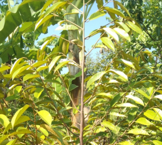 Vườn sầu riêng anh nay được 2 năm tuổi, tổng được 200 gốc, trong đó có 70 cây giống Musanking, 100 giống Ri6, còn lại giống Thái, bên cạnh đó anh còn trồng xen bơ, chuối.