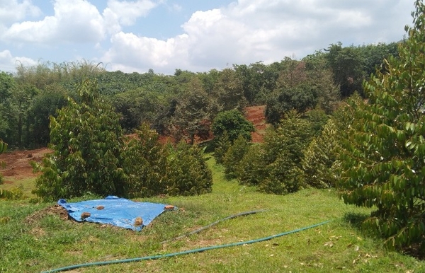 Hiện nay vườn của chú Cường đang chăm sóc cho 100 sầu riêng Ri6 đang được 2 năm tuổi và chú cũng mới xuống giống Ri6 thêm được khoảng 100 cây được 1 năm tuổi và có 5-6 cây 5 năm lúc trước chú trồng thử nghiệm và đang mang trái. Khi đội ngũ kỹ thuật 3 Tốt đến thăm vườn của chú thì trước tiên là vườn chú nằm ngay chân đồi không quá dốc, chú trồng sầu riêng khoảng cách là 8x8, vì vườn nằm ngay dốc đồi nên chú có trồng cỏ cho vườn giữ lại đất và chất dinh dưỡng không bị trôi khi mưa và giúp cho vườn của chú Cường không bị nóng rễ dẫn đến tình trạng cháy lá trên cây sầu riêng. Độ cao trung bình của những cây 2 năm là 2m5 và chú Cường cũng hay thường xuyên tỉa cành và tạo tán, và kỹ thuật tỉa cành tạo tán chú xem hướng dẫn trên Kênh Youtube của đội ngũ anh em Kỹ Thuật 3 Tốt để giúp một cây sầu riêng có tán hình cây thông giúp cây đều tán và dễ dàng chăm sóc.