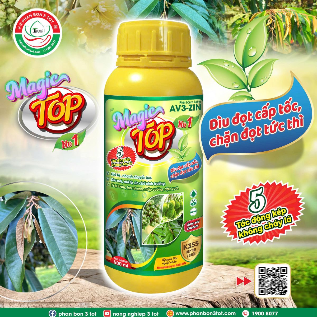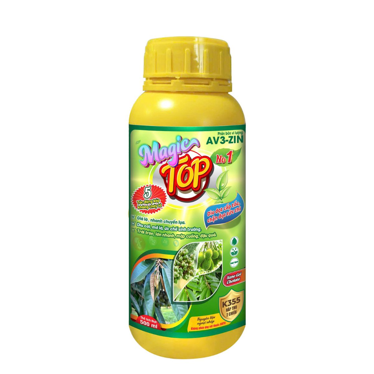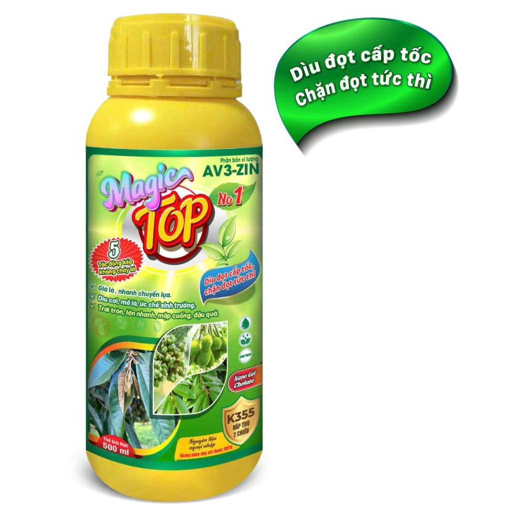 MAGIC TOP giúp già lá lụa nhanh, chặn đọt tức thì, đồng thời ngăn vàng lá, xoắn lá, lem lép hạt, méo trái, rụng hoa và trái non do thiếu vi lượng. Giúp lá xanh dày, tăng sức chống chịu phèn, mặn, khô hạn và lạnh.