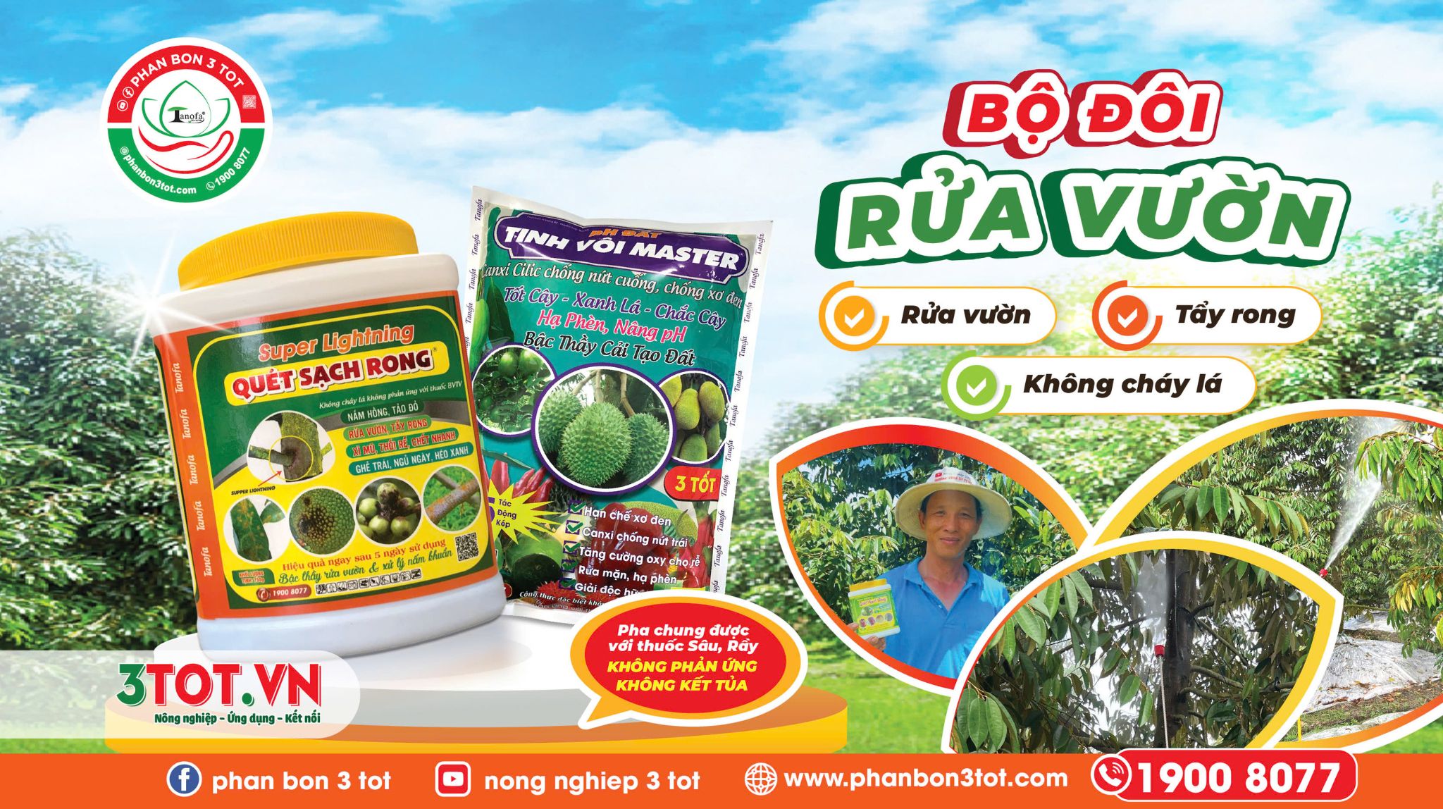 Để tối ưu hiệu quả rửa vườn, nhà vườn 3 TỐT chọn Bộ đôi rửa vườn gồm Quét sạch rong Super Lightning và Tinh Vôi Master hiệu quả, an toàn, dễ sử dụng và đã được nhiều nhà vườn kiểm chứng thực tế.