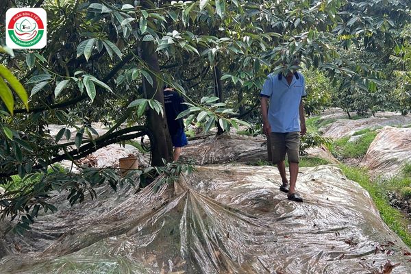 Ngoài ra, bà con cần đậy mủ lại và sau 2-3 ngày, kiểm tra độ ẩm đất. Nếu thấy đất khô, bà con có thể nhẹ nhàng tưới nước và tiếp tục đậy mủ. Đến khi cây sầu riêng hoàn toàn xổ nhụy, bà con mới nên dọn mủ.