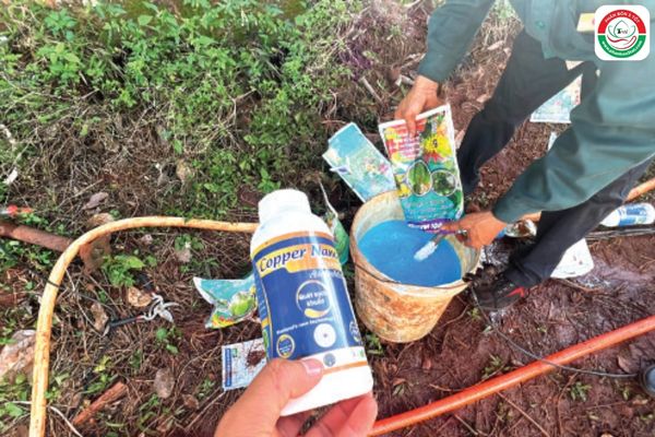 (Hình ảnh nông dân tiến hành pha loãng và tưới gốc bằng Copper Nano Đồng hữu cơ)