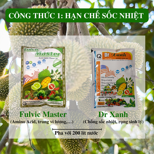 Fulvic Master (Amino Acid, trung vi lượng,…) + Dr Xanh (Chống sốc nhiệt, rụng sinh lý) pha với 200 lít nước phun đều qua lá