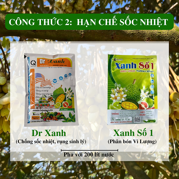 Dr Xanh (Chống sốc nhiệt, rụng sinh lý) + Xanh số 1( Phân bón Vi Lượng) pha với 200 lít nước phun đều qua lá.