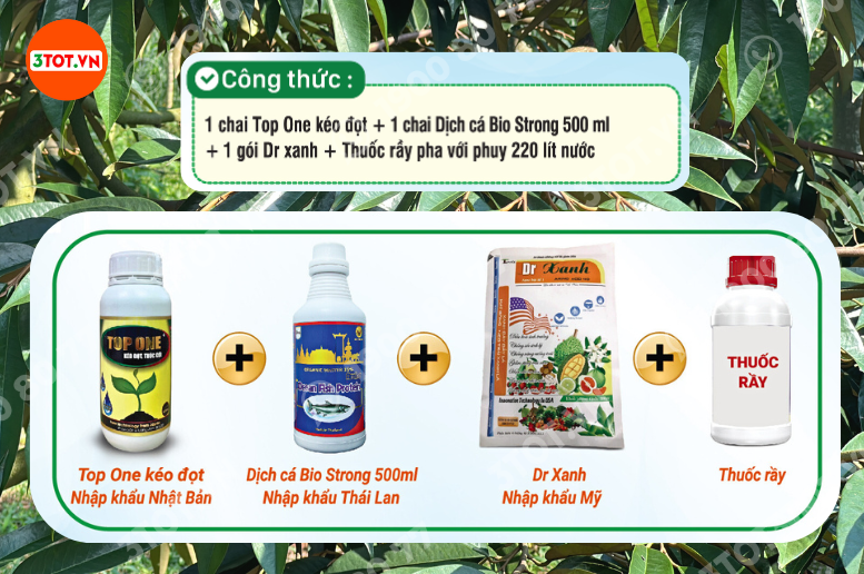 Công thức phun: 1 chai Top One kéo đọt + 1 chai Dịch cá Bio Strong 500ml + 1 gói Dr Xanh + Thuốc sâu rầy pha với phuy 200 lít nước.