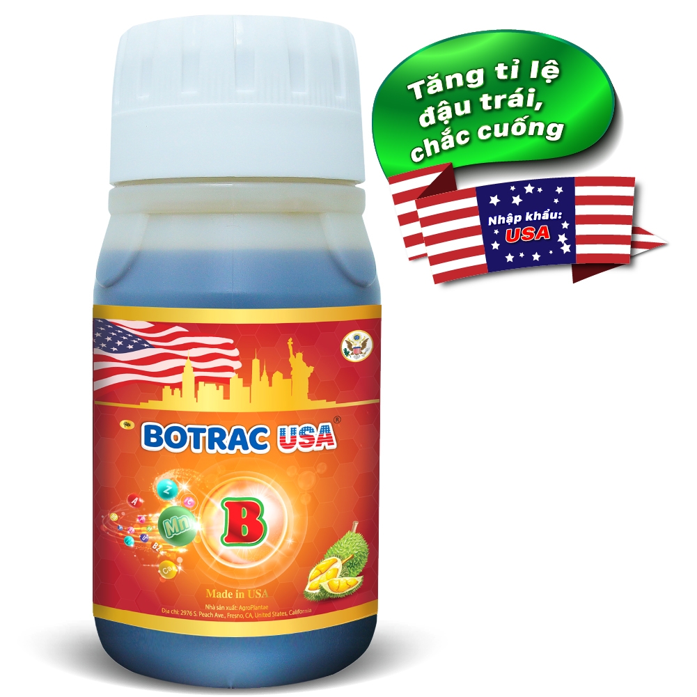 Botrac USA chống rụng trái sinh lý, sau xổ nhuỵ, nứt cuống, thối trái do thiếu Bo, chắc cuống, cứng cành, chống nứt gai, xơ đen, hạn chế đen bông.