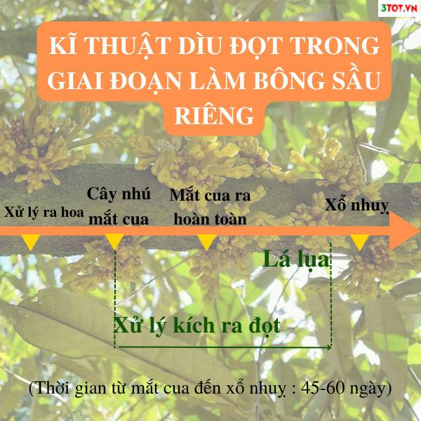 -Cây sầu riêng nhú mắt cua đến khi xổ nhuỵ thông thường từ 45-60 ngày. Trong thời điểm này cần phải kích cho cây ra đọt nhanh để đến khi xổ nhuỵ lá đã lụa hoặc chuyển già.