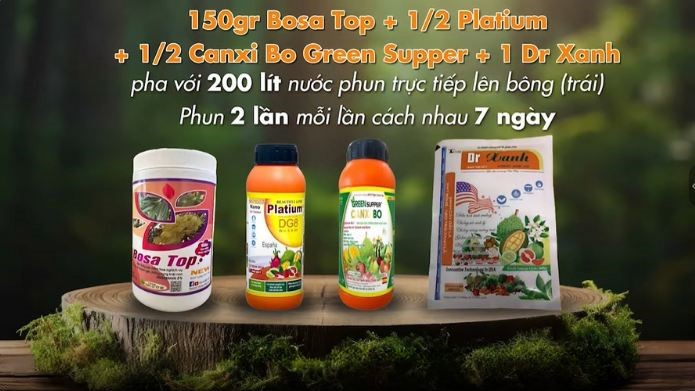 150gr Bosa Top + ½ Chai Kali hữu cơ (Hoặc Silver với công thức NPK 0:25:30) + ½ Canxi Bo chai 500mL + 1 gói Dr Xanh pha với 200 lít nước để chỉnh trái, giúp tròn trái, xanh trái, và chắc cuống.